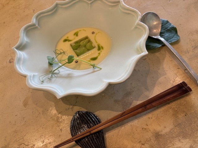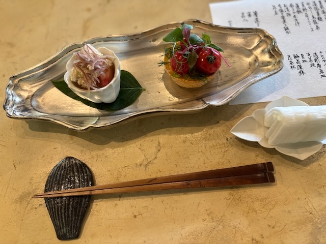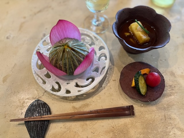 食事に合わせたお茶が提供され、食事はどれも優しい味付けで、スイスイと胃袋の中に吸い込まれていく。 どのお料理も、細部にまで手を入れた美しい風景で、私の好みの味付けであった。これが本当にもてなすと言うことかもしれないと、お茶を飲みながらしみじみ思う。