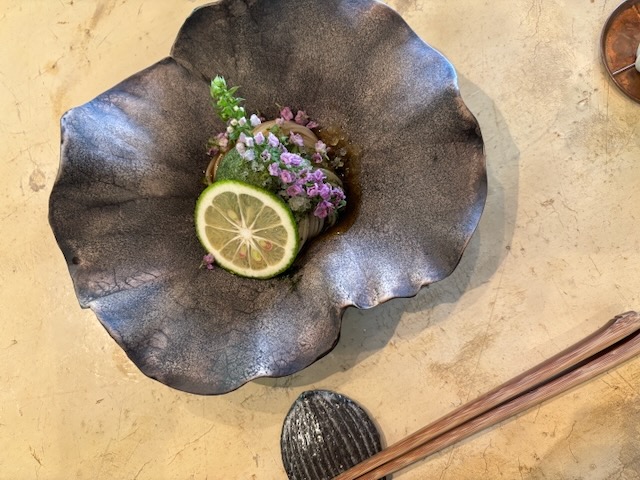 そのお茶会が開かれる場所は、大分県臼杵市の臼杵の石の仏像がある麓。 一番古くから石像の近くでお土産屋さんをやっていた一族の方々が、臼杵焼を作っておられて、その器に蓮のお茶会のお料理が盛り付けられる。 臼杵焼は一度途絶えてしまったそうな。それを復活させて、今日に至る。 白磁に近い焼き物の土は、天草産だそうでなぜか先の旅とリンクした。